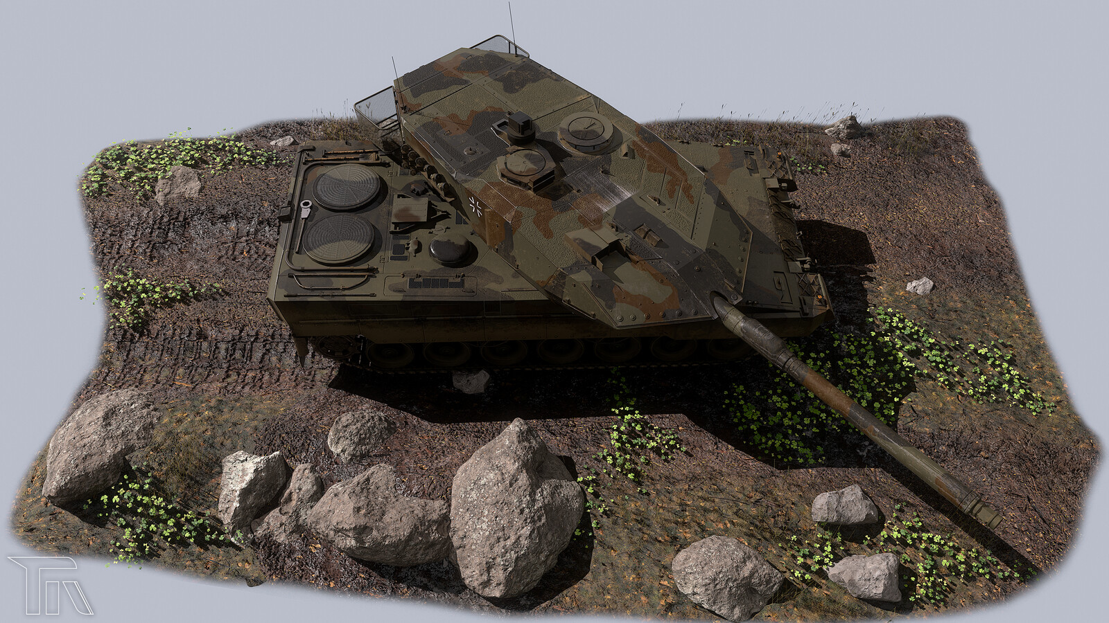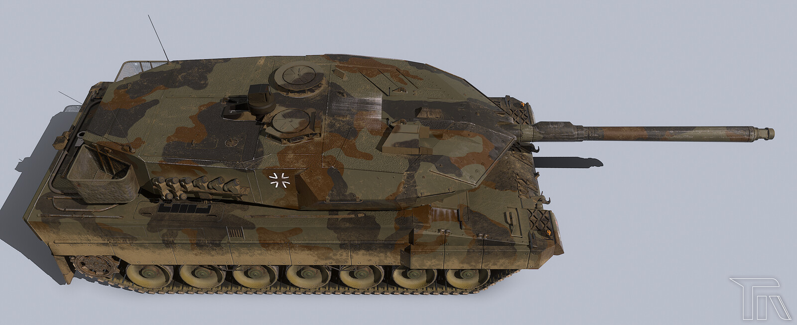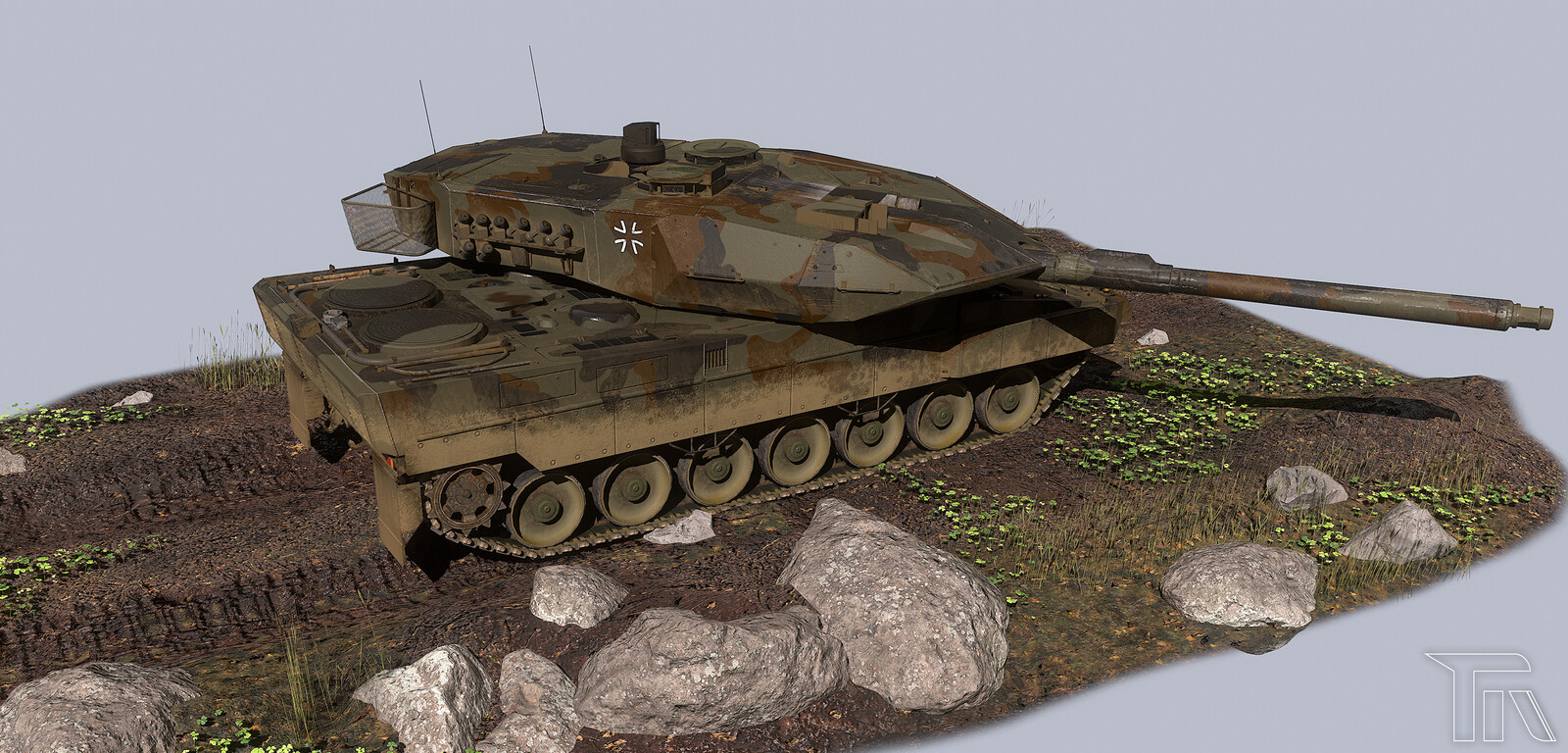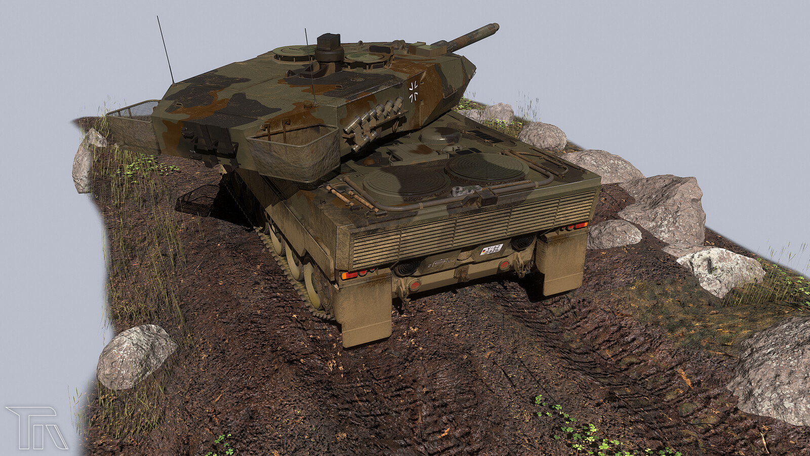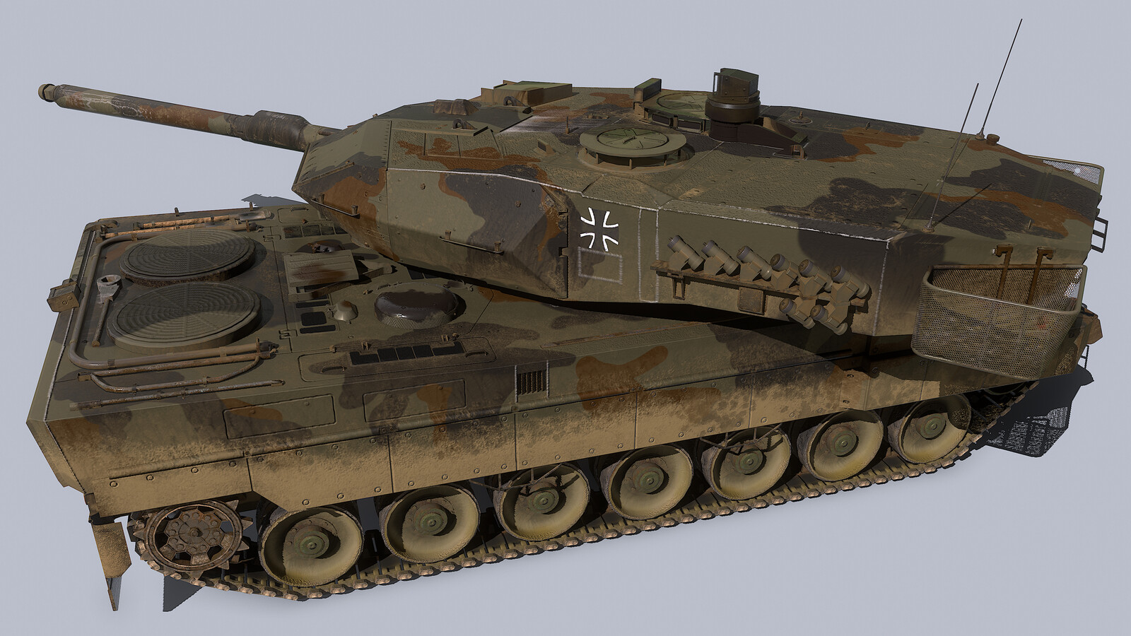 The non-slip grippy texture on the top of the tank turret and on the body was hand painted. I noticed on my reference images some weathered and dirty 2A6's had varying levels of light dirt, loose dirt, caked on mud, and some sand. I used some procedural rain effects in places where the water would run down the panels and clear off the light dirt. On top of the turret when the gun barrel moves up I included the metal scraping that's evident on all the tanks.